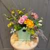 This cute ceramic container comes in three curated pastel shades; we will select the perfect hue to complement today’s freshest blooms. Each arrangement is thoughtfully designed with a playful mix of soft textures and bright, happy florals—think sunny focal flowers, delicate accents, and airy greenery that give it that just-picked-from-the-garden feel.