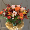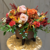 Our Modern Copper Centerpiece brings fall to life with rich seasonal blooms, artfully arranged in a sleek metal planter with a warm copper finish and modern wooden stand. A stunning gift or décor piece for Thanksgiving and autumn celebrations.