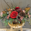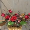 Bring a stylish, earthy touch to your Thanksgiving or Christmas table with this modern ceramic centerpiece. Designed with winter greens, magnolia leaves, pinecones, dried mushrooms, and a bold red gerbera daisy focal, it’s the perfect blend of natural texture and holiday color. Premium size features an elevated artistic design with red roses.