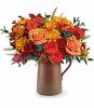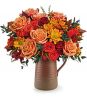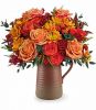 Celebrate fall with Teleflora's Terra Bloom Bouquet, a stunning mix of autumn flowers in a rustic stoneware pitcher. With rich orange and maroon hues, this seasonal arrangement is perfect for Thanksgiving décor or a warm harvest gift.